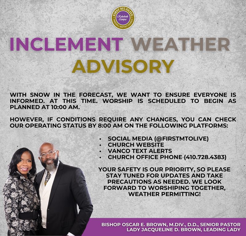 INCLEMENT WEATHER UPDATE FOR SUNDAY, DECEMBER 14, 2025: DEAR FIRST MT. OLIVE FAMILY, WE WANT TO INFORM YOU THAT WORSHIP WILL BEGIN ON SCHEDULE AT 10:00 AM TODAY. PLEASE USE CAUTION AS YOU TRAVEL AND STAY SAFE. WE LOOK FORWARD TO SEEING YOU SOON!