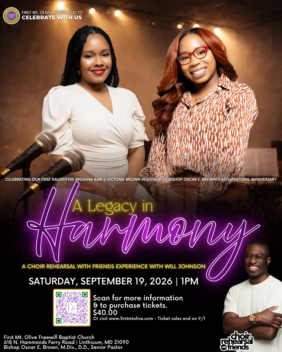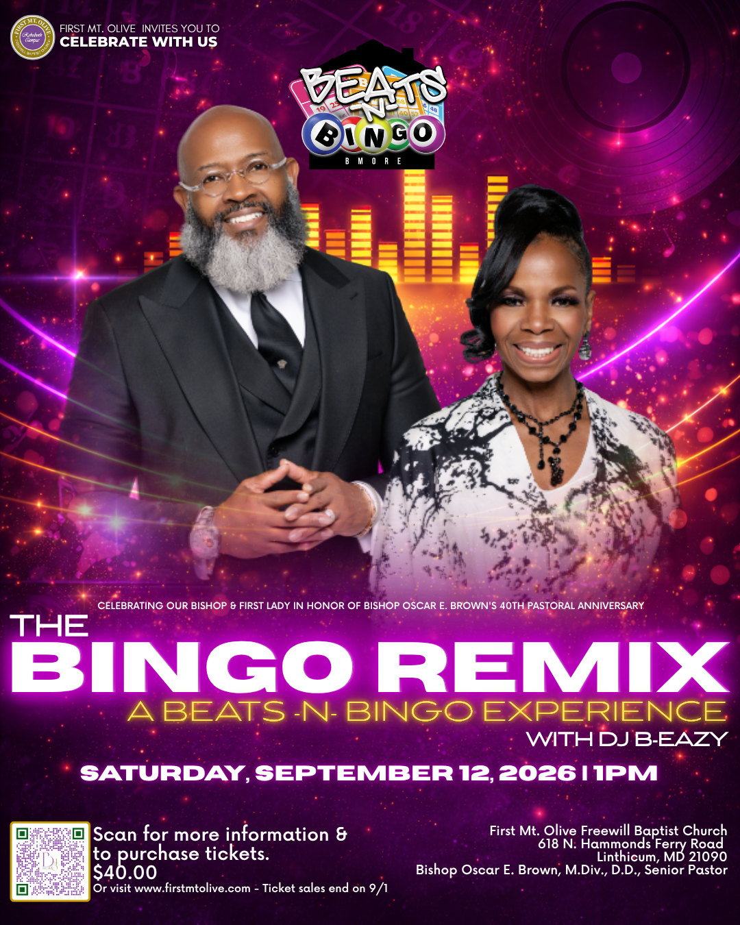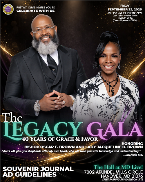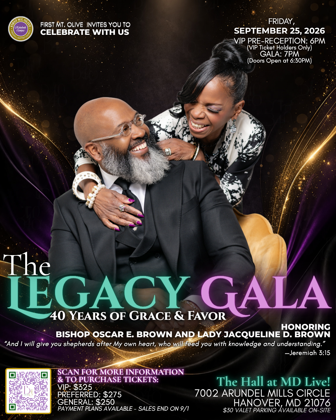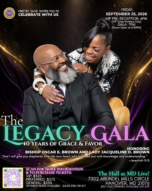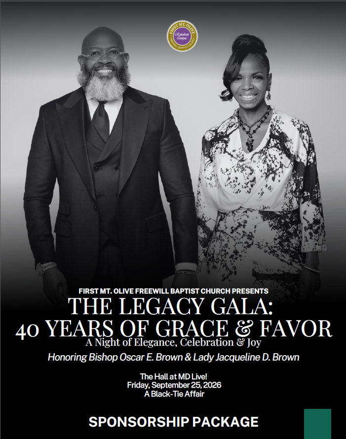 For 40 years, Bishop Oscar E. Brown and Lady Jacqueline D. Brown have faithfully led First Mt. Olive Freewill Baptist Church with unwavering commitment, compassion, and vision—impacting thousands of lives across Baltimore and beyond. This anniversary is more than a milestone; it is a celebration of legacy, leadership, and lasting community impact.