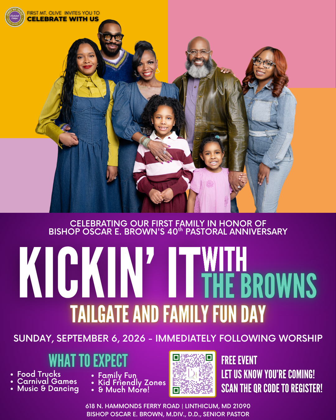 Kickin’ It With The Browns is a tailgate-style family celebration honoring the entire First Family for 40 years of love, service, and leadership. The day will include carnival games, food trucks, live entertainment, and fun for all ages as the church and community come together for an afternoon of fellowship, laughter, and celebration.