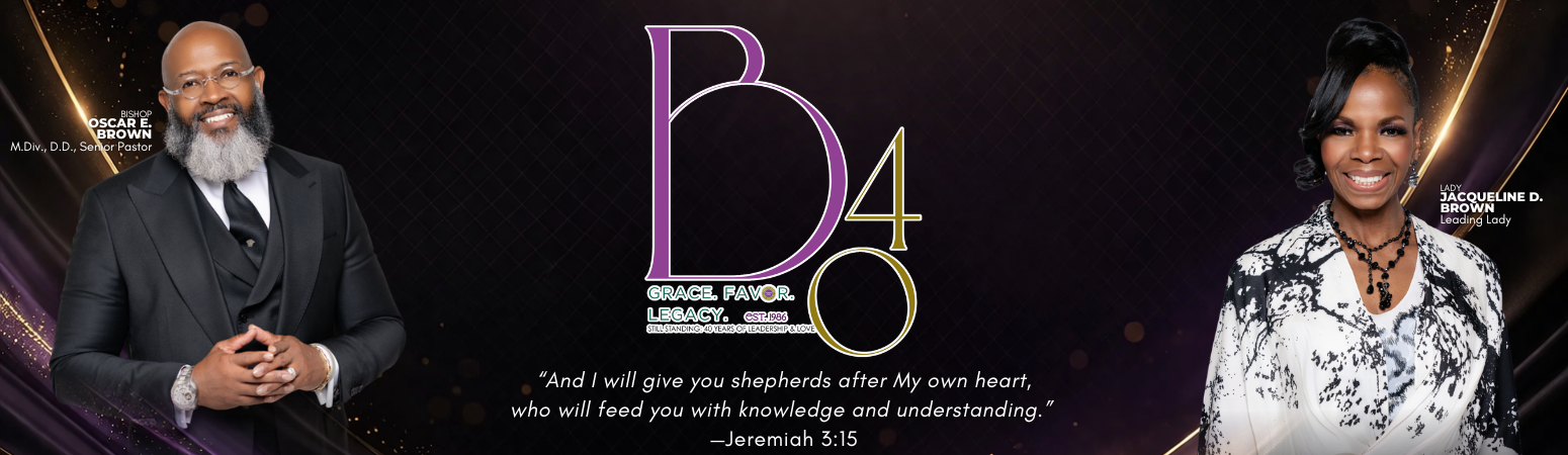 It is with immense joy and heartfelt gratitude that we invite you to join us in celebrating a remarkable milestone—the 40th Pastoral Anniversary of our esteemed leader, Bishop Oscar E. Brown and our God-sent First Family. This momentous occasion, themed “Grace. Favor. Legacy. Still Standing: 40 Years of Leadership & Love” honors four decades of faithful service, spiritual leadership, and unwavering dedication to God’s people.